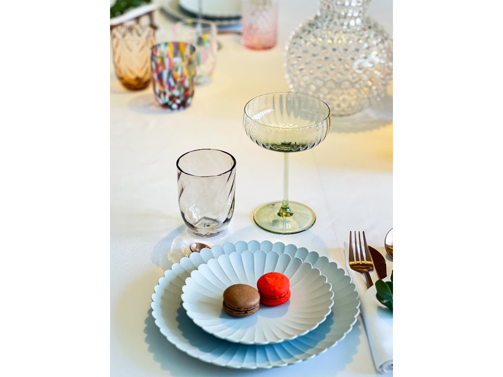 The Lyon Champagne Saucer has a soft and inviting design that is contrasted by its bold colours and simplistic, rippled patterning. Handmade and designed by founder of Anna von Lipa, Jytte Correll.